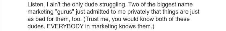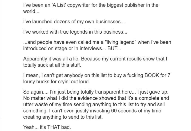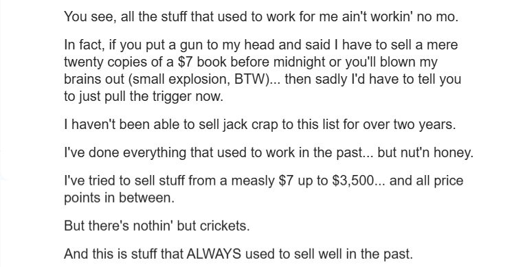 Plot Twist! After nearly 20 years, this copywriter (universally recognized as the world's greatest copywriter to those "in the know", though rarely even heard of by anyone else) has broken his silence and reemerged onto the marketing scene with an all-new newsletter that reveals his best secrets. This hidden newsletter, to my knowledge, is not publicly advertised and known only through referral. I leak the link to subscribe.